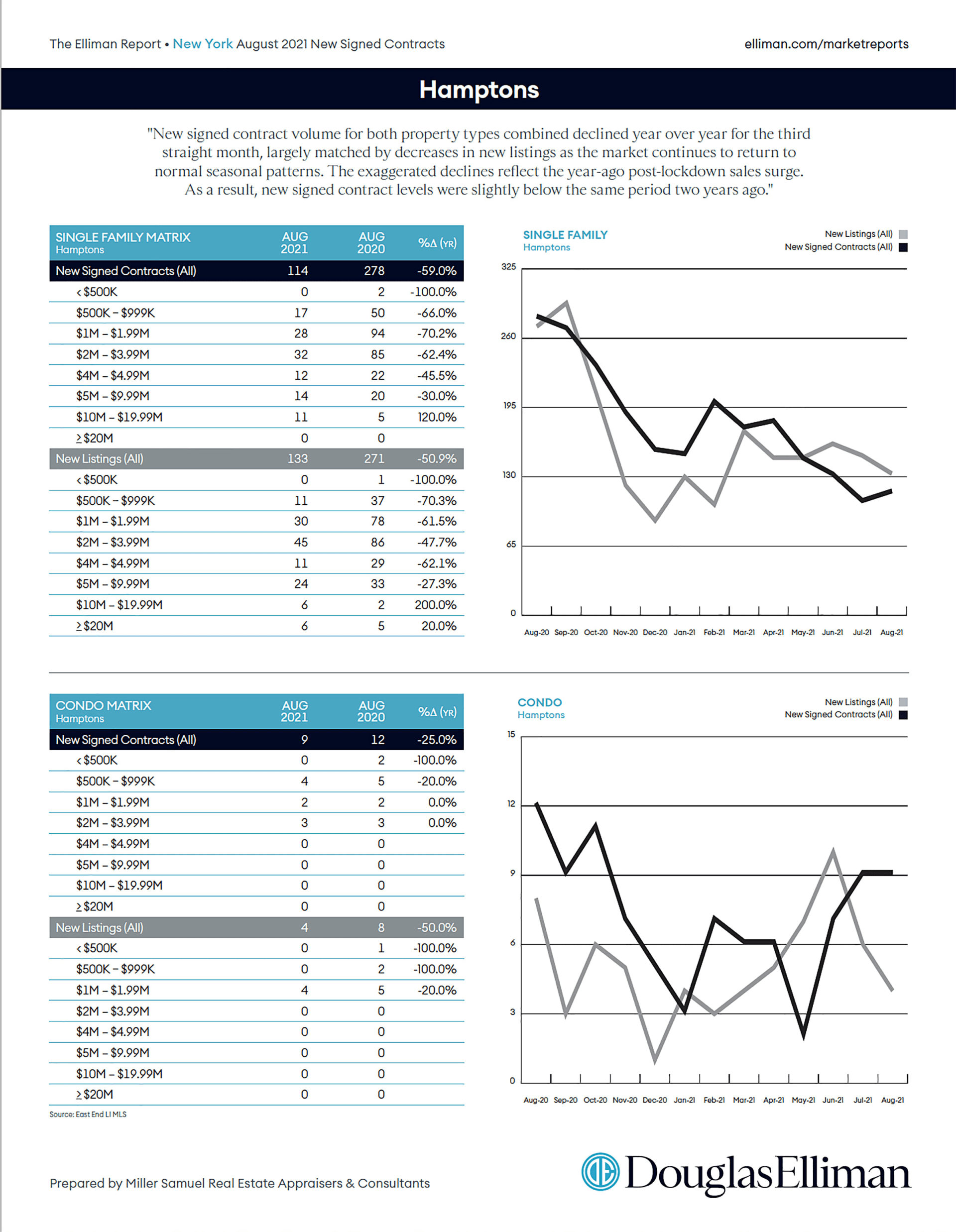 New signed contract volume for both property types combined declined year over year for the third straight month, largely matched by decreases in new listings as the market continues to return to normal seasonal patterns. The exaggerated declines reflect the year-ago post-lockdown sales surge. As a result, new signed contract levels were slightly below the same period two years ago.”