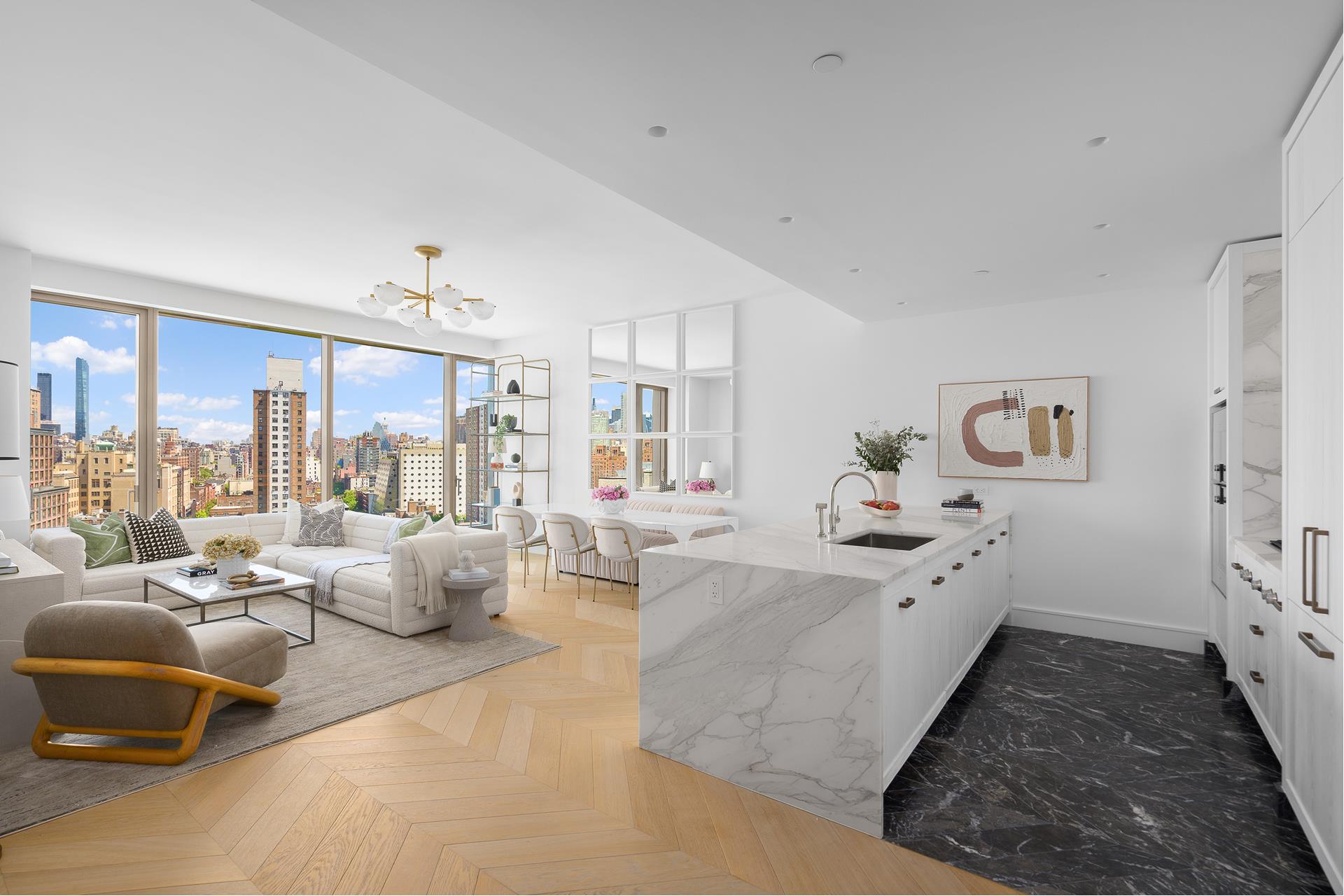 East 15E at One High Line is a 1,512 SF two-bedroom and two-and-a-half-bathroom home featuring big eastern city skyline views through a wall of floor to ceiling windows. This exceptional home boasts a generous great room finished with natural oak chevron floors and open kitchen with elegant Carnico Grigio marble floors, Molteni brushed Epicea wood and white lacquer cabinetry with cove lighting, and honed Calacatta Gold marble countertops, backsplash, and island with bar seating. Fully integrated appliances include a Gaggenau refrigerator, convection oven, speed oven, and Miele ventilation hood, dishwasher, and under-counter wine refrigerator.
